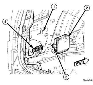 10. Tilt the rear of the module (2) away from the quarter panel and disengage the mounting tab from the locating slot (1).