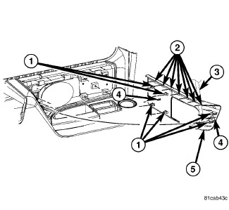 b. Carefully disengage the scuff plate end tabs (4) from the left and right quarter trim panels (5).