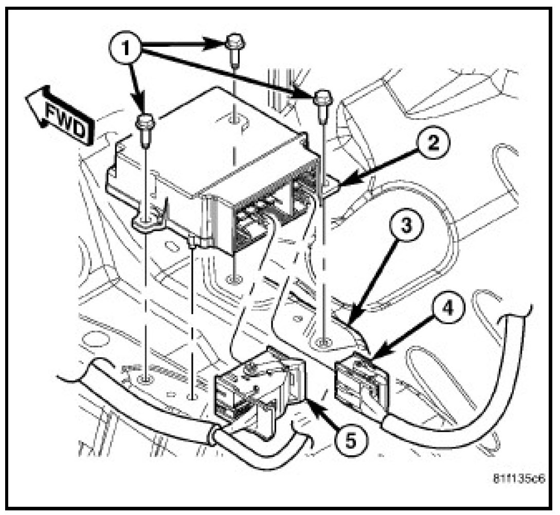 3. First reconnect the body wire harness connector (5), followed by the instrument panel wire harness connector (4) to the ORC connector receptacles located on the rearward facing side of the module. Be certain that the latches on both connectors are each fully engaged.