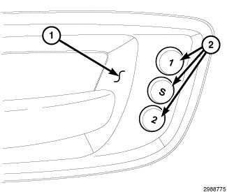 When equipped, the memory seat switch (2) is located on the driver door trim panel (1). The driver seating position can be automatically adjusted for two different driver preference settings using the memory seat switch. The memory switch is a resistor multiplexed unit that is hard wired to the left Front Door Module (FDM). The left FDM in turn sends out the memory system set and recall requests to the other electronic modules over the Controller Area Network (CAN) data bus.