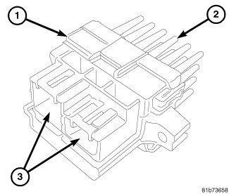 The front blower motor power module is mounted to the HVAC housing, on the passenger side of the vehicle. The blower motor power module consists of a molded plastic mounting plate (1) with two integral wire connector receptacles (3). Concealed behind the mounting plate is the power module electronic circuitry and a large finned heat sink (2).