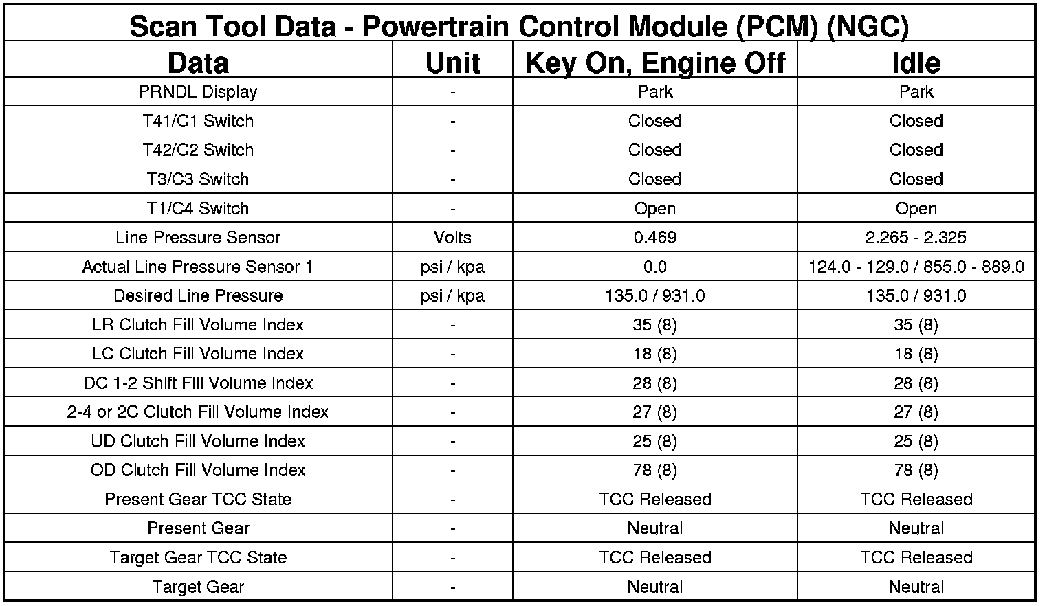 The following chart lists data values taken from the Scan Tool Powertrain Control Module (PCM) data list for the NGC controller. The values were taken at key on, engine off and at idle. The data is to be used for reference only.