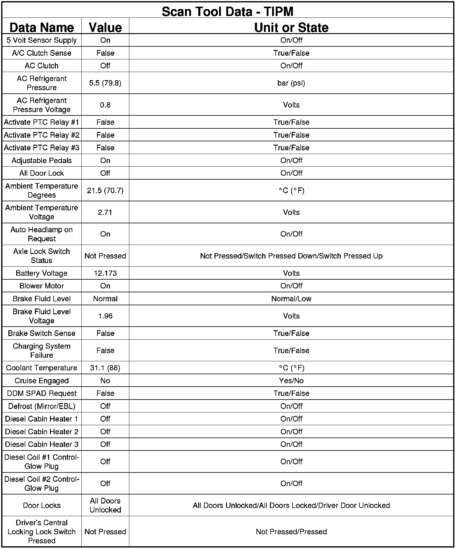 The following chart lists data values taken from the Scan Tool Totally Integrated Power Module (TIPM) data list. The data is to be used for reference only.