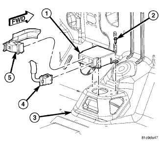 1. Working from the right side of the floor panel transmission tunnel, carefully position the Occupant Restraint Controller (ORC) (1) to the ORC mounting bracket (3) welded onto the top of the floor panel transmission tunnel. When the ORC is correctly positioned, the arrow on the ORC label will be pointed forward in the vehicle and the locating pins on the bottom of the ORC will be engaged into the locating holes in the bracket.