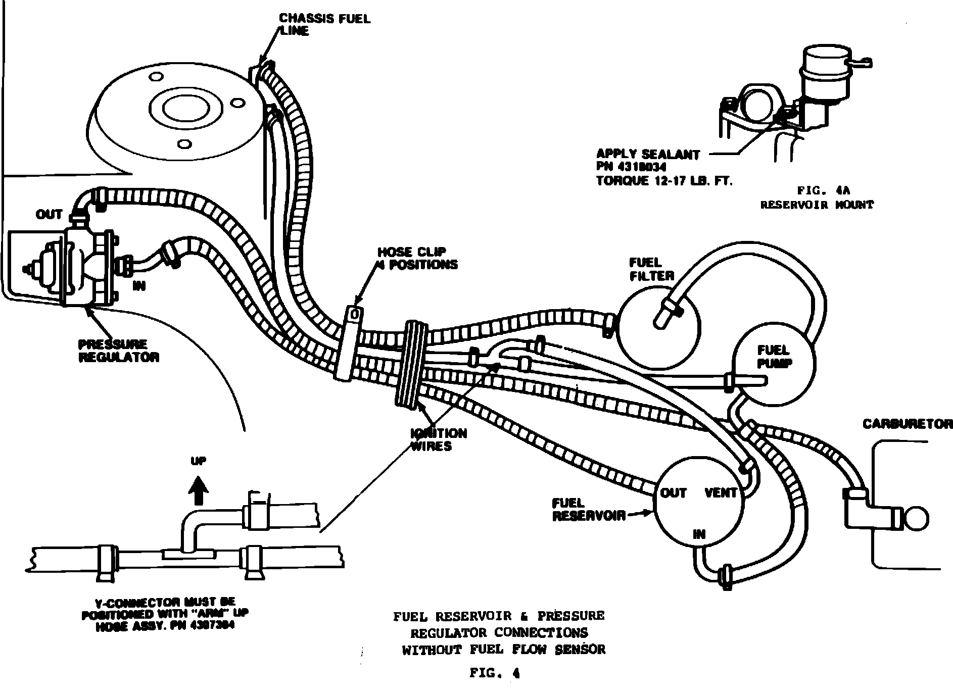 Connect hose, PN 4307762, from the fuel reservoir outlet on the bottom of the reservoir to the pressure regulator inlet (lower fitting) (Figure 4). Route this hose over the coolant hose and under the ignition wires. Clamp with hose clamp, PN 6500650. Torque to 10 inch pounds.