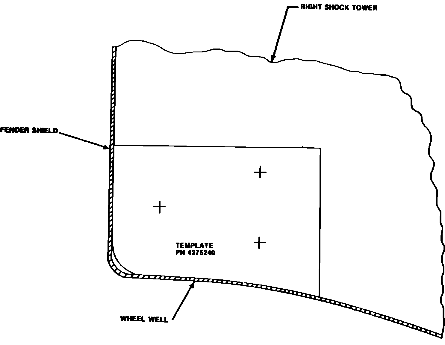 7. To mount the pressure regulator, tape the pressure regulator bracket template, PN 4275240, to the right side shock tower (Figure 6). Carefully locate the template against the right fender shield and wheel well (keep the top side of the template level). Center punch three screw hole locations and drill three .165" diameter (#21 drill) holes. Attach the pressure regulator bracket with three self-tapping screws, PN 6031991, and tighten securely.