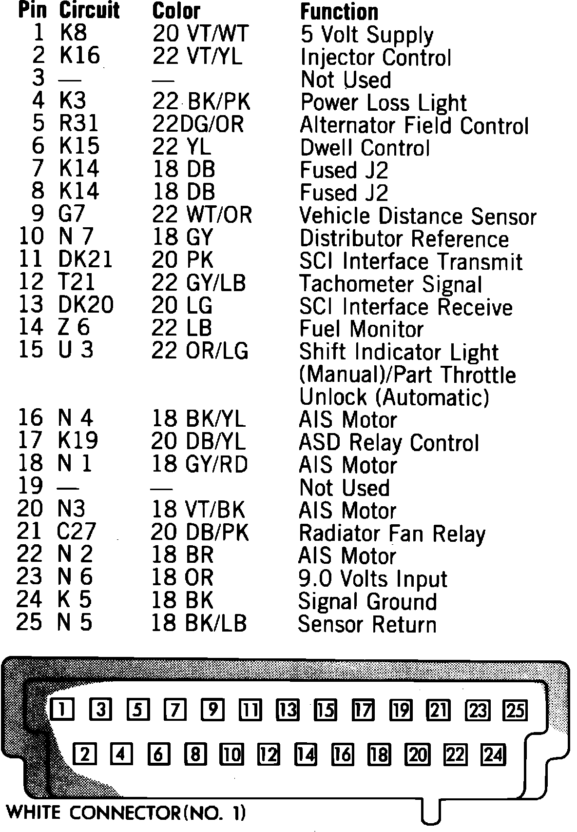 Fig. 8 Logic module white connector terminal identification. 1987 models: