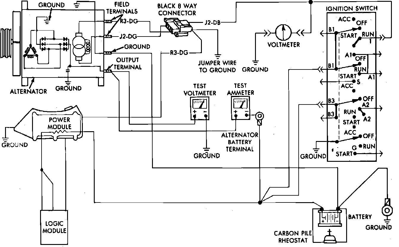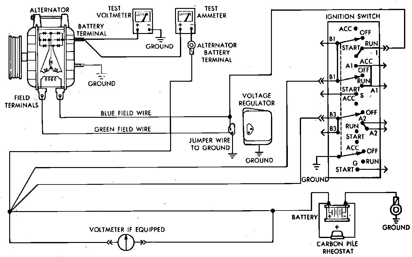 1. Disconnect battery ground cable, complete test connections as shown and start engine and operate at idle. Immediately after starting, reduce engine speed to idle.
