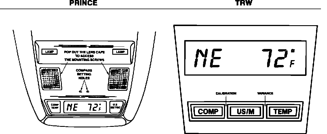 Although made by different manufacturers, both of the overhead consoles function essentially the same. There are some minor physical differences; the Prince unit has two buttons, while the T.R.W. unit has three buttons. The third button allows the operator to turn the compass and temperature displays "On or Off" individually.
