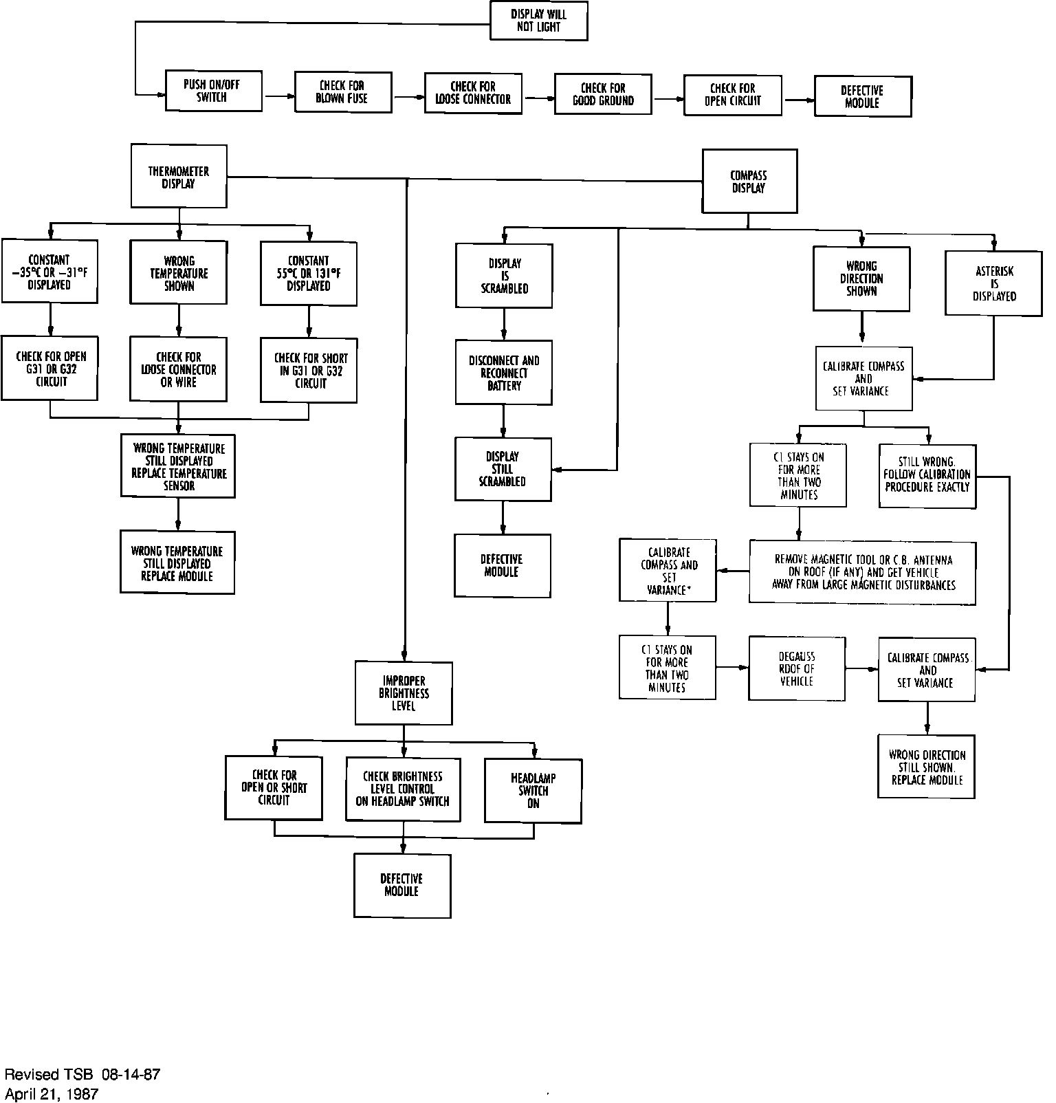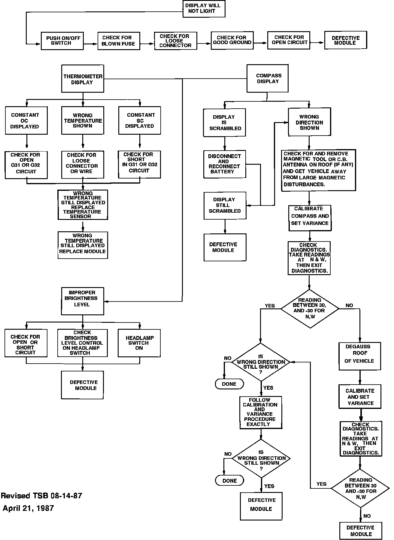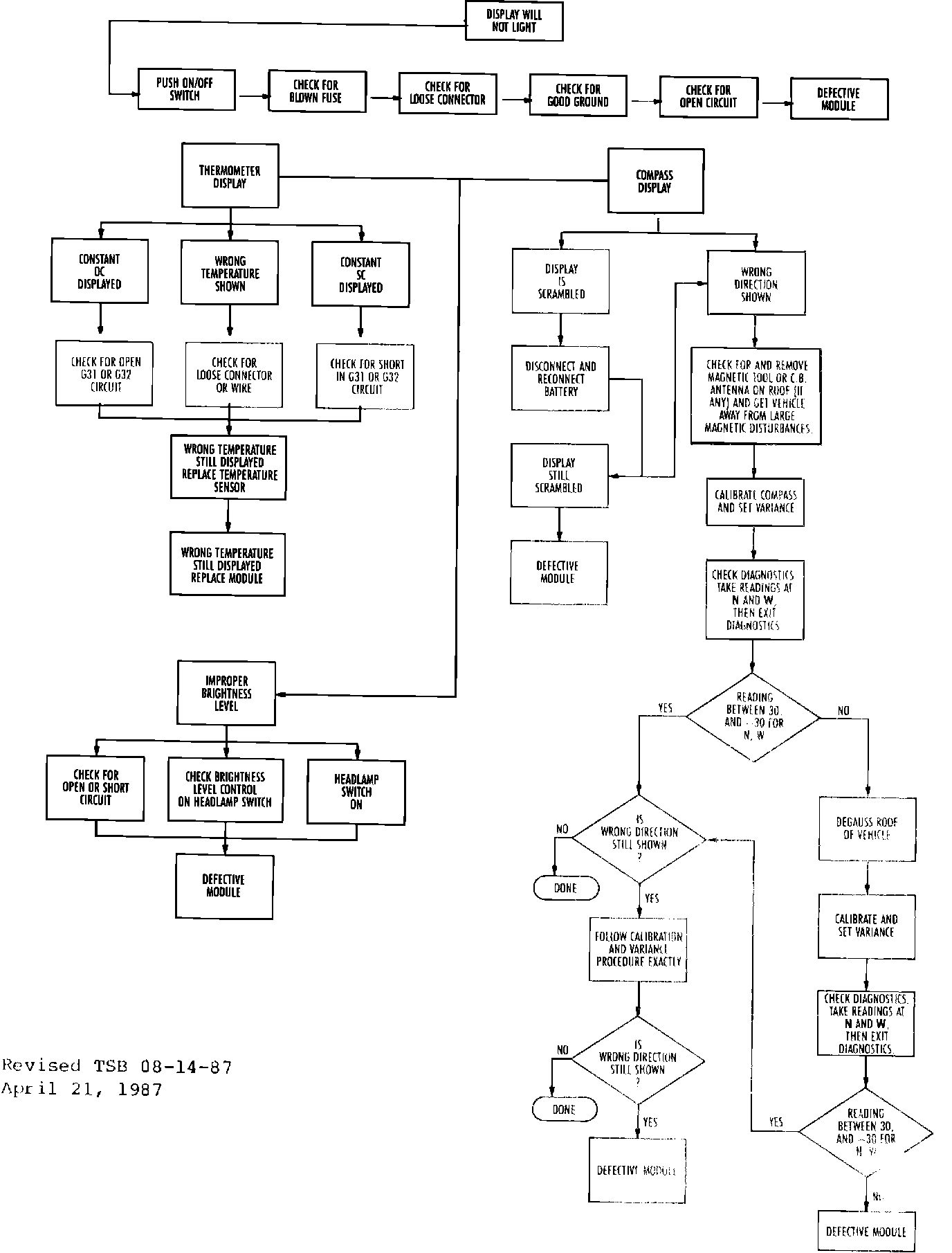 The Overhead Console Compass and Thermometer Diagnosis Flow Charts have been revised to include vehicle de-gaussing. The attached revisions should be inserted in the 1987 service manuals as follows: