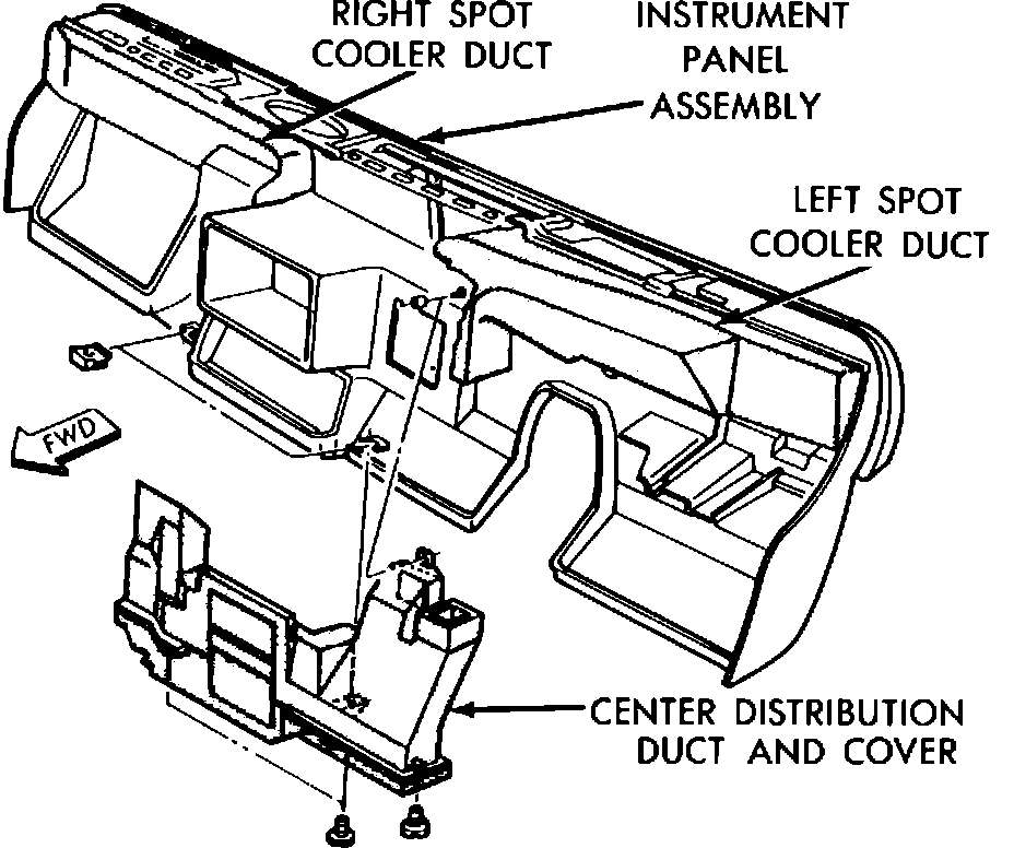 10. Remove center distribution duct (1 screw at left center A/C outlet opening and 2 at rear edge of distribution duct).