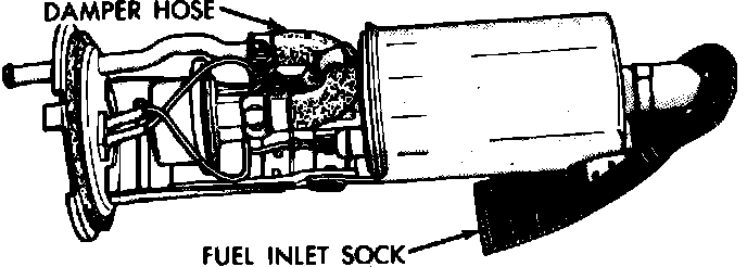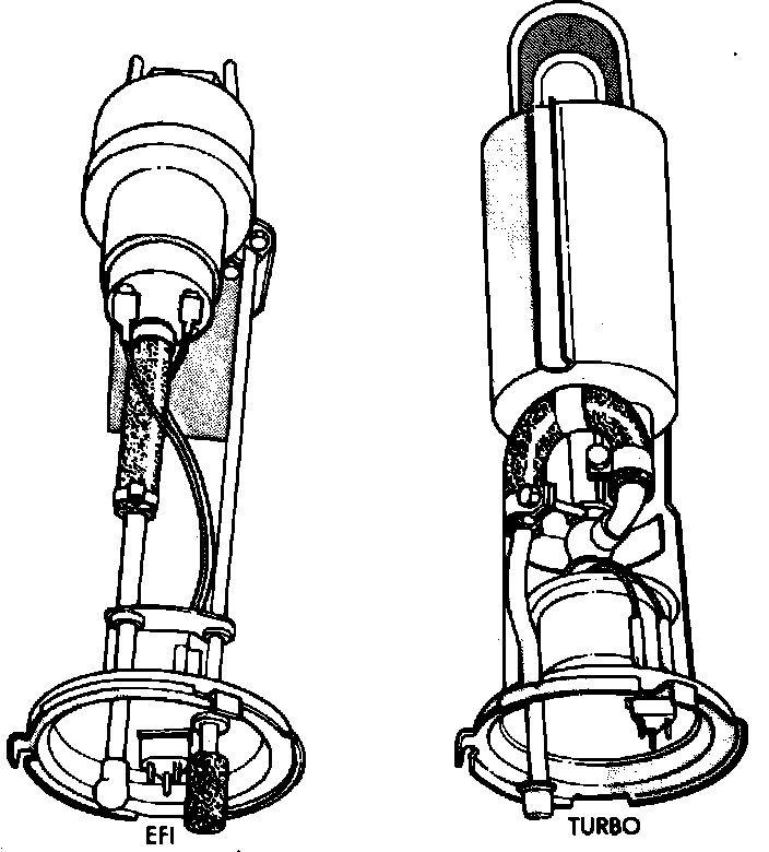 The fuel pump used in the EFI system, Fig. 1, is a positive displacement, roller vane, immersible pump with a permanent magnet type electric motor. The fuel is drawn in through the filter sock and pushed through the electric motor to the outlet. The pump contains check valves that restrict fuel movement in either direction when the pump is not operational. Operating voltage is supplied to the pump through the Auto Shutdown (ASD) relay.