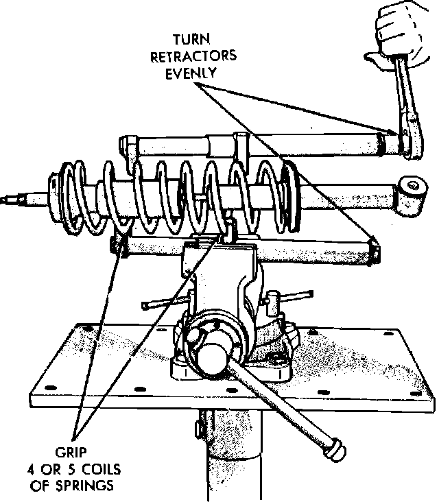 1. Install coil spring retractors, tool L-4514, or equivalent, on coil spring and support in a vise. Grip 4 or 5 coils of the spring in the retractors. Also, do not extend retractors more than 91-4 inches.