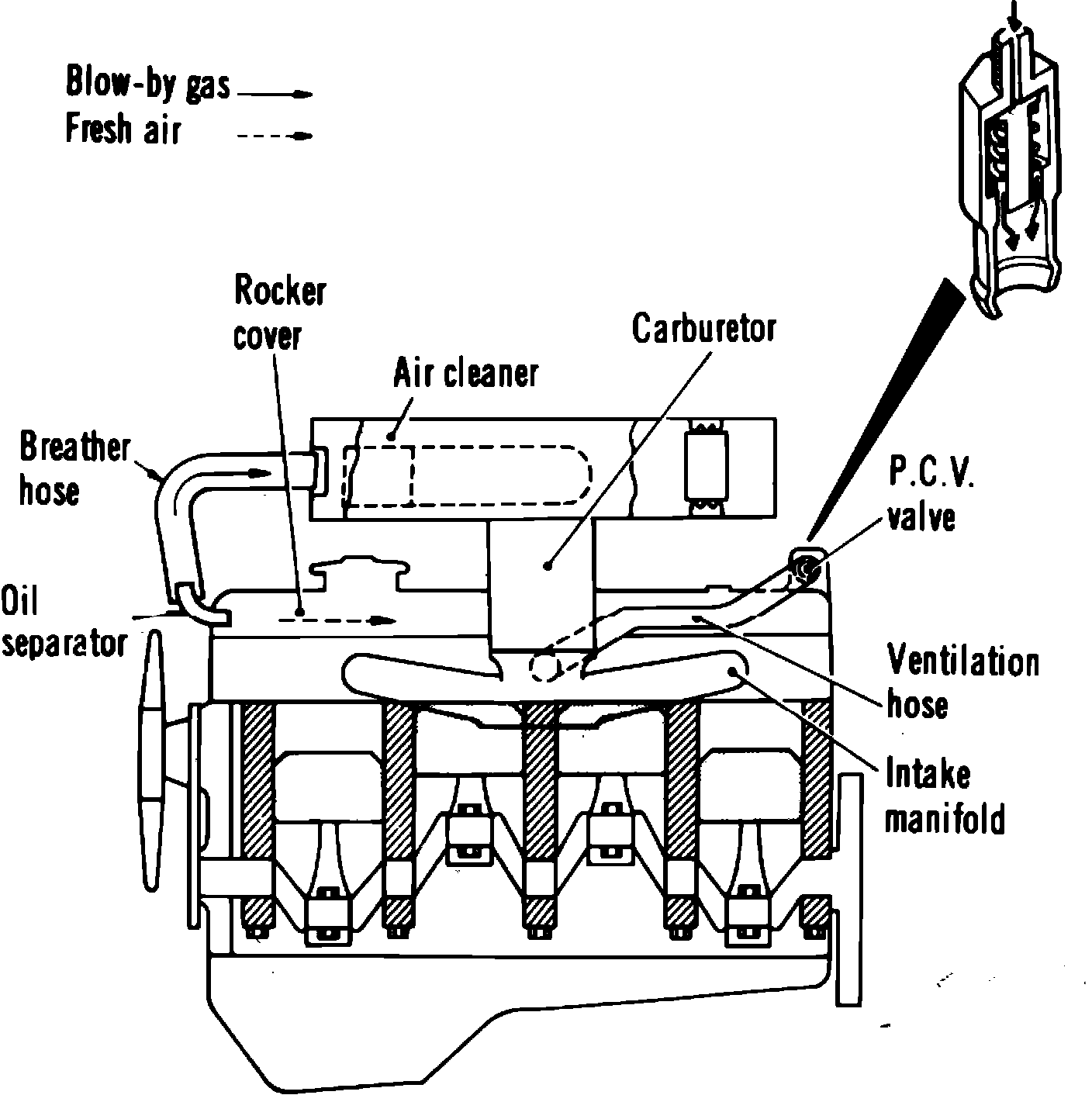 This system incorporates a PCV valve which is located at the rocker arm cover, Fig. 1. With this system, fresh air is routed from the air cleaner to the front of the valve cover and into the crankcase where the fresh air is mixed with the blow-by gasses. The mixture of fresh air and blow-by gasses then passes through the PCV valve and is drawn through a hose to the intake manifold and to the combustion chamber. Under high speed or during acceleration conditions, the blow-by gasses are drawn through the PCV valve to the intake manifold and through the breather to the air cleaner and routed into the combustion chamber.