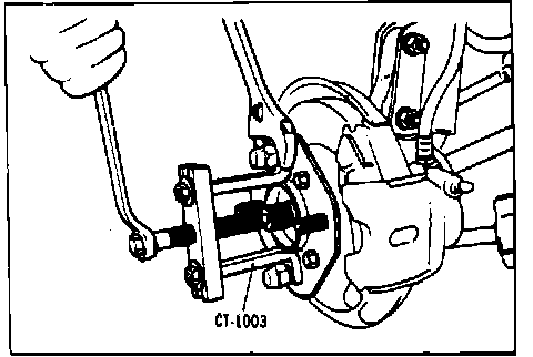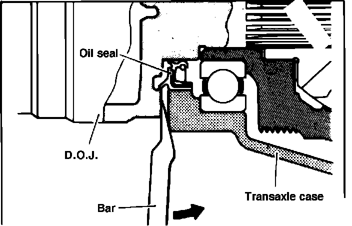 6. On drive axles not equipped with center bearing, insert pry bar between transaxle case and drive shaft, then pry drive axle from transaxle case. Remove drive axle from hub using tool No. CT-1003 or equivalent. Do not pull on drive axle or joints will be damaged. Do not insert pry bar further than necessary or damage to oil seal will result.
