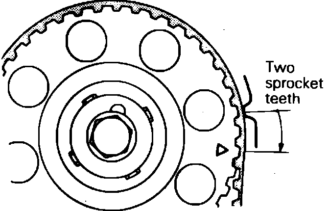 4. Rotate crankshaft clockwise until mark on camshaft sprocket is 2 teeth away from mark on cover or cylinder head, Fig. 49. This causes spring pressure of No. 2 exhaust valve to apply specific tension to tension timing belt. Do not rotate crankshaft counterclockwise, as belt tension will be adversely affected.