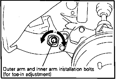 Toe is adjustable by rotating the outer and inner arm mounting bolts. If toe-in is not within specifications, rotate left and right outer arm and inner arm bolts, each by the same amount, to perform adjustment. An adjustment of approximately 0.08 inch (2 mm) will be made when the outer arm and inner arm bolts are turned the equivalent of 1 alignment mark.