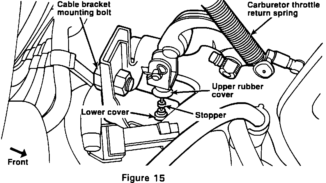 1. Verify that the engine is at normal operating temperature.2. Locate the transmission throttle control cable, and raise the upper rubber cover upwards to expose the cable stopper (Figure 15).