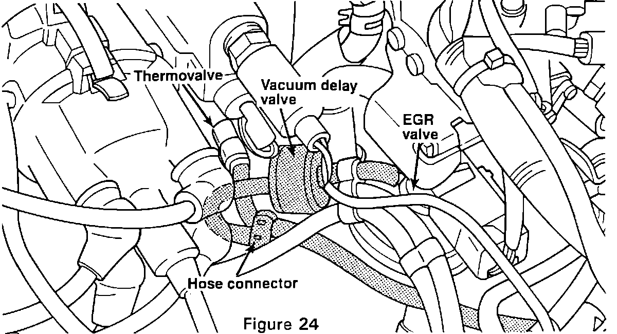 3. Install the hose assembly between the EGR valve and the thermovalve as shown. Connect the hose from the vacuum delay valve to the EGR valve. Connect the hose from the harness connector to the thermovalve (Figure 24).
