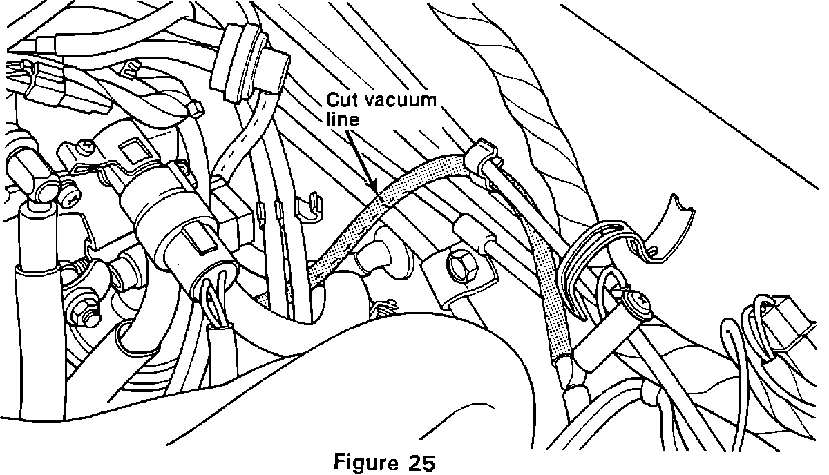 4. Locate and cut the vacuum hose from the intake manifold vacuum joint as shown in Figure 25. This is the vacuum hose or tee leading to the air cleaner which was plugged during Step A-1.