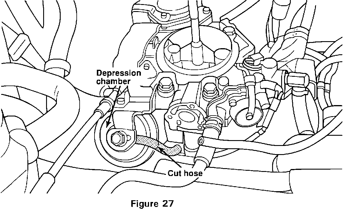 6. Locate the vacuum hose connecting the carburetor base and the depression chamber. Cut the hose as shown (Figure 27).