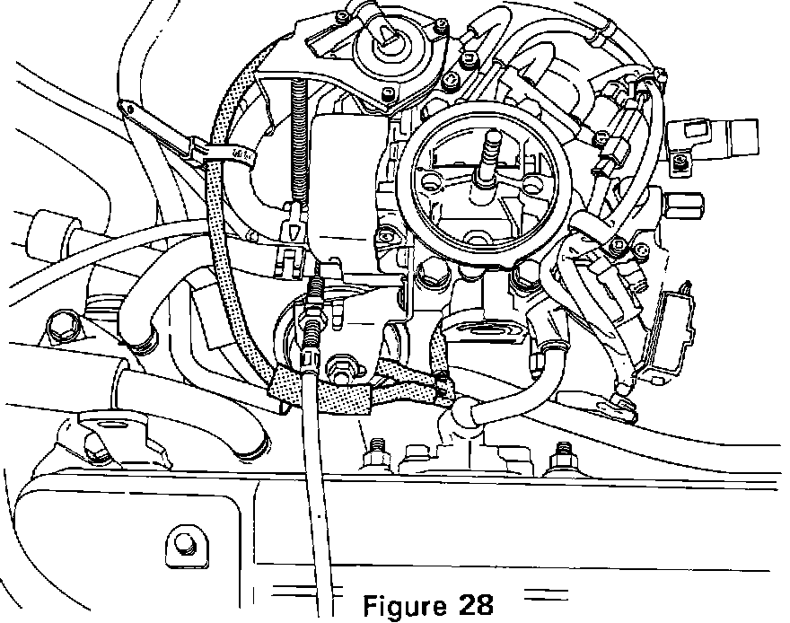 7. Route the vacuum hose harness around the rear of the carburetor and insert the F-connector into the cut ends of the hose (Figure 28).
