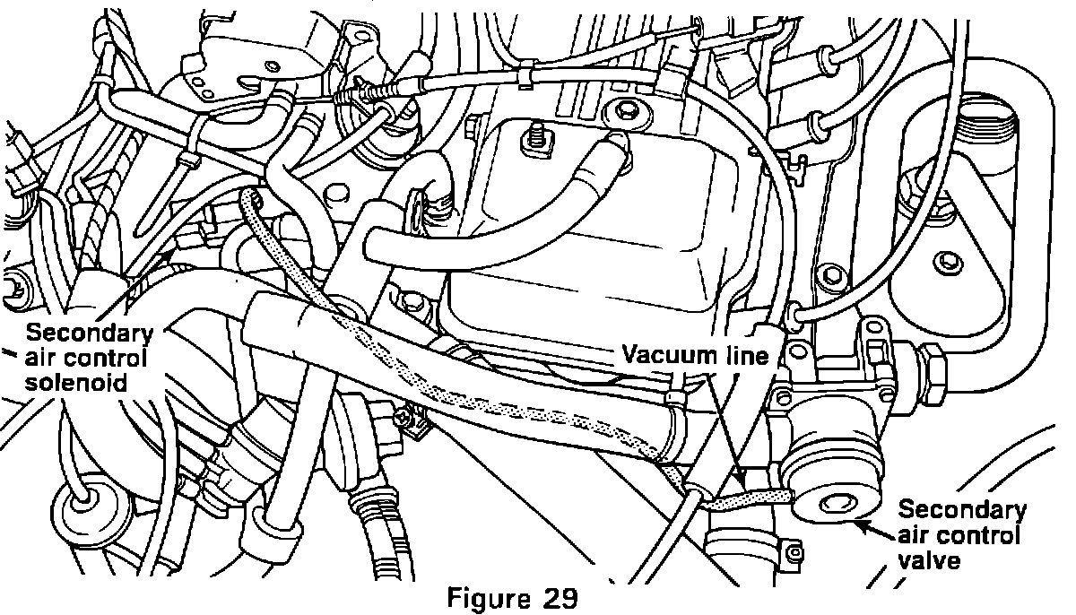 9. Locate and remove the vacuum hose connecting the Secondary Air Control Solenoid and the Secondary Air Control Valve (Figure 29).