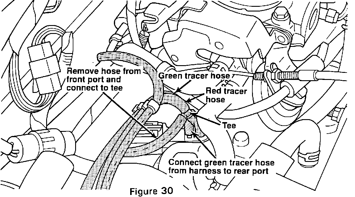 10. Disconnect the remaining vacuum hose from the Secondary Air Control Solenoid front port and connect it to the tee in the red tracer hose of the harness. Connect the short line from that tee to the front solenoid port (Figure 30). Connect the green tracer hose from the harness to the rear solenoid port.