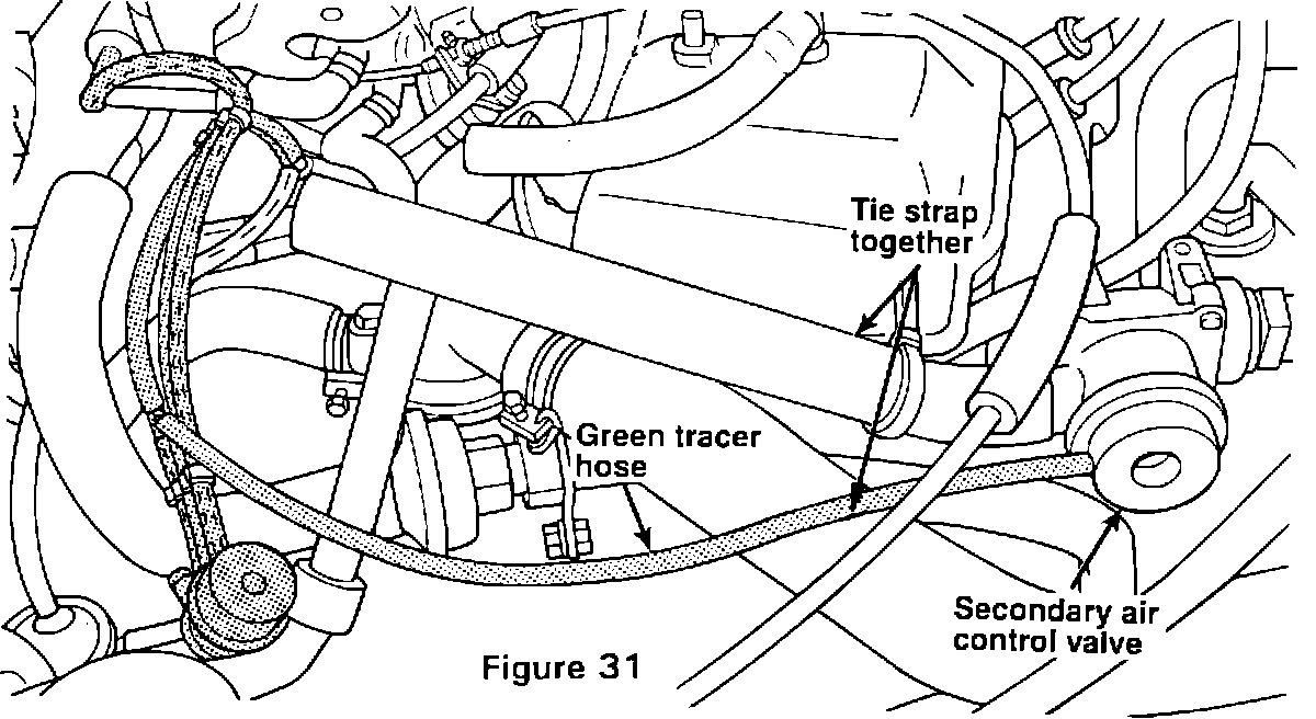 11. Connect the remaining green tracer hose of the harness to the Secondary Air Control Valve. Retain the hose in place using the longer of the two supplied tie wraps (Figure 31).