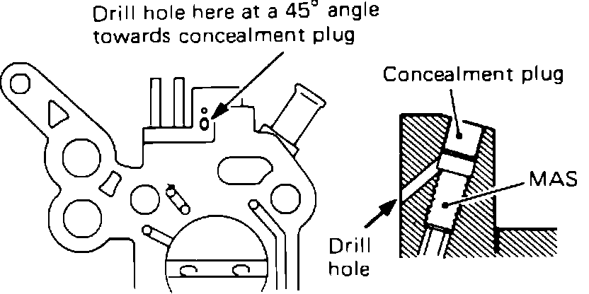 3. Drill a 2mm pilot hole in the casting surrounding the idle mixture adjusting screw (MAS) then redrill the hole to 3mm. Fig. 3