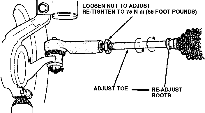To adjust toe-in, center steering wheel and hold in position with a suitable tool. Loosen tie rod locknuts and rotate the rod, to adjust toe-in to specifications. Use care not to twist steering gear rubber boots. Torque tie rod locknuts to 55 ft. lbs. (75 Nm). Adjust position of steering gear rubber boots. Remove steering wheel holding tool.