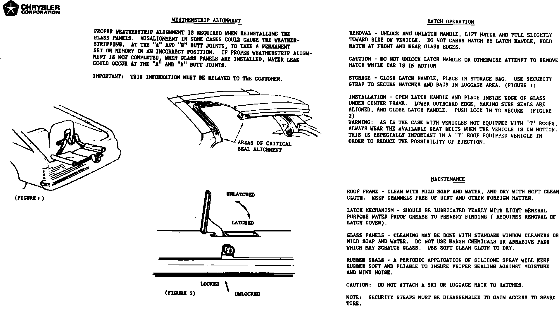 OPERATION AND MAINTENANCECHRYSLER "T" ROOF: