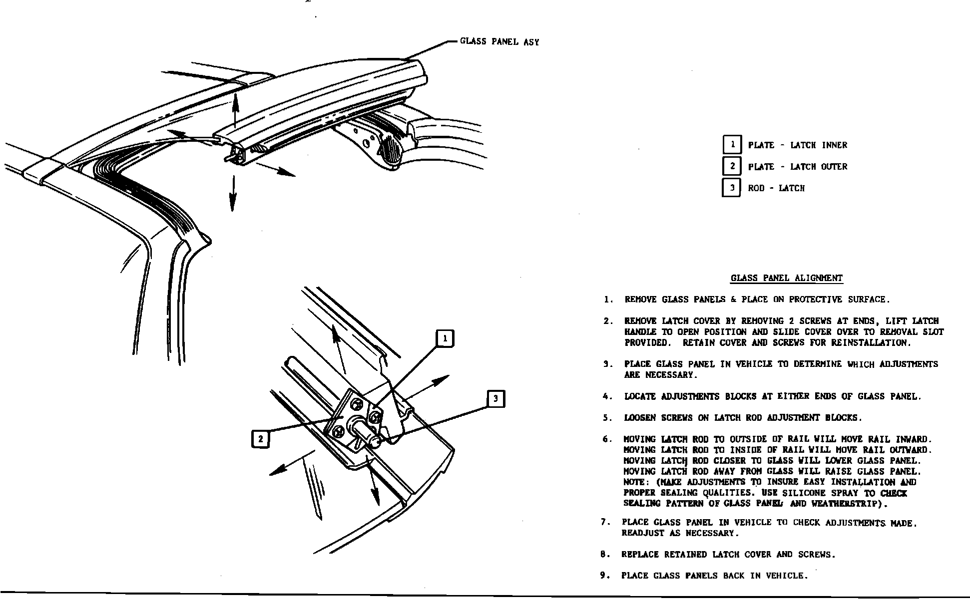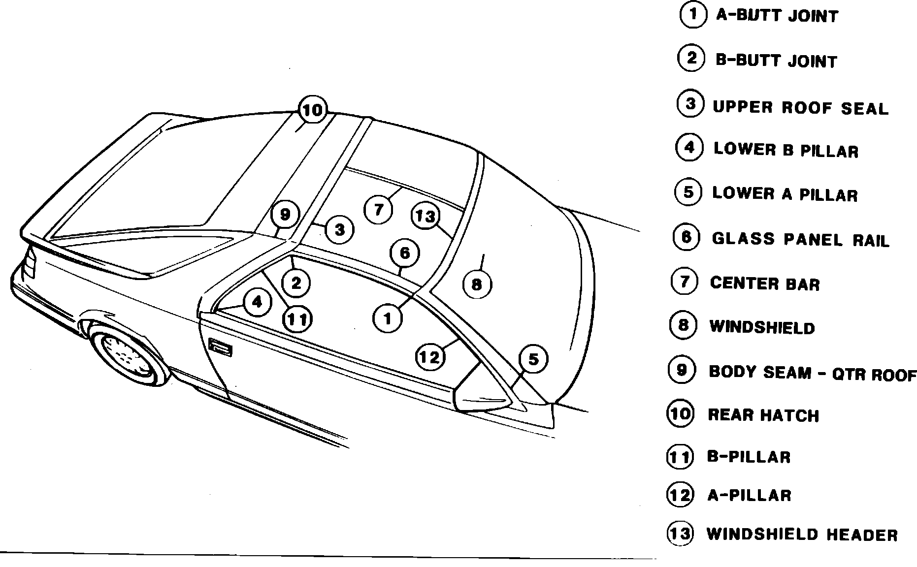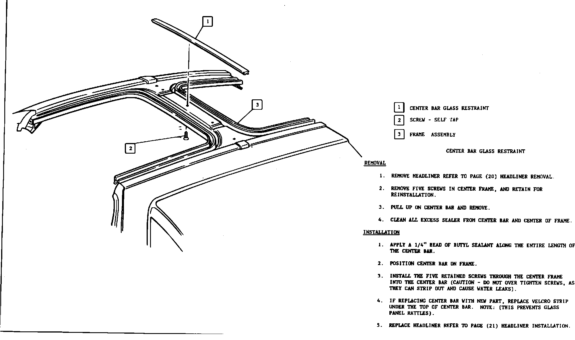 NOTE: GLASS MUST BE INSTALLED WITHIN 20 MINUTES OF BEAD APPLICATION. REMOVE EXCESS URETHANE SEALER USING NAPTHA OR EQUIVALENT SOLVENT. SEAL HOLES IN "T" -ROOF FRAME WHERE MOLDING WAS ATTACHED, WITH A BUTYL SEALANT. THEN, REPLACE HEADER ROOF MOLDING AND "A" PILLAR MLDGS. (REFER TO PAGES 17 & 18) WATER TEST ASSEMBLY. IF ADDITIONAL SEALING IS REQUIRED, A PUMPABLE BUTYL SEALER MAY BE USED.