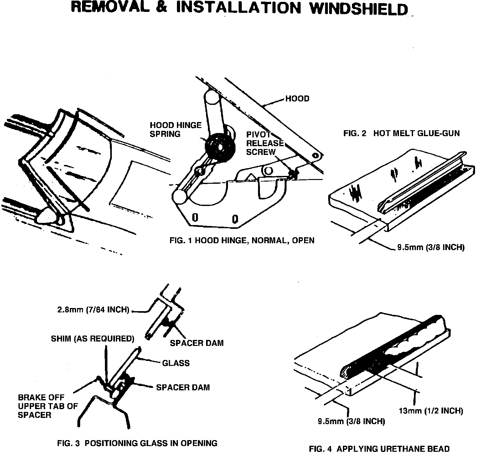 REMOVAL REMOVE ROOF MOLDINGS AS OUTLINED ON PAGES 16 & 18. PLACE PROTECTIVE COVERINGS OVER THE AREAS ADJACENT TO THE GLASS BEING REPLACED. REMOVE BOLTS FROM HOOD HINGES THAT ALLOW HOOD TO MOVE FORWARD, AS SHOWN IN (FIG.1), THEN PULL HOOD TO FORWARD POSITION. REMOVE "A" PILLAR MOLDING AND HEADER ROOF MOLDINGS, AS SHOWN ON PAGES 16 & 18. CAREFULLY REMOVE GLASS RETAINER BY PULLING IT FROM THE URETHANE. REMOVE INTERIOR GARNISH MOLDING, IF NECESSARY, AND CUT GLASS FROM OPENING USING AN ELECTRIC KNIFE, AS CLOSE TO THE GLASS AS POSSIBLE. SHAVE DOWN ANY HIGH SPOTS OF URETHANE FROM THE FENCE FLANGE USING A UTILITY KNIFE TO ALLOW A FLUSH GLASS INSTALLATION (COMPLETE URETHANE REMOVAL IS NOT NECESSARY). USING URETHANE METAL PRIMER, PRIME ANY BARE METAL SPOTS ON FENCE FLANGE, ALLOW 18 MIN. DRY TIME. NOTE: IF URETHANE COVERS THE COMPLETE PERIPHERY OF THE FENCE FLANGE, THE USE OF METAL PRIMER WILL NOT BE NEEDED. CLEAN THE INSIDE OF OUTER EDGE OF GLASS USING NAPHTHA OR OTHER EQUIVALENT SOLVENT TO REMOVE RESIDUE. IN A VERY WELL VENTED AREA, PRIMER THE INSIDE OUTER PERIPHERY OF THE GLASS 15.88 MM (5/8"), FROM THE EDGE, USING A WIPE OFF URETHANE GLASS PRIMER. WIPE EDGES DRY AFTER PRIMER APPLICATION. APPLY SPACER DAM TO THE INSIDE OUTER PERIPHERY OF THE GLASS, 9.5 MM (3/8") FROM EDGES USING A HOT MELT GLUE GUN, AS SHOWN IN (FIG.2), IF THE FENCE FLANGE IS CLEAN AND NO URETHANE EXISTS.