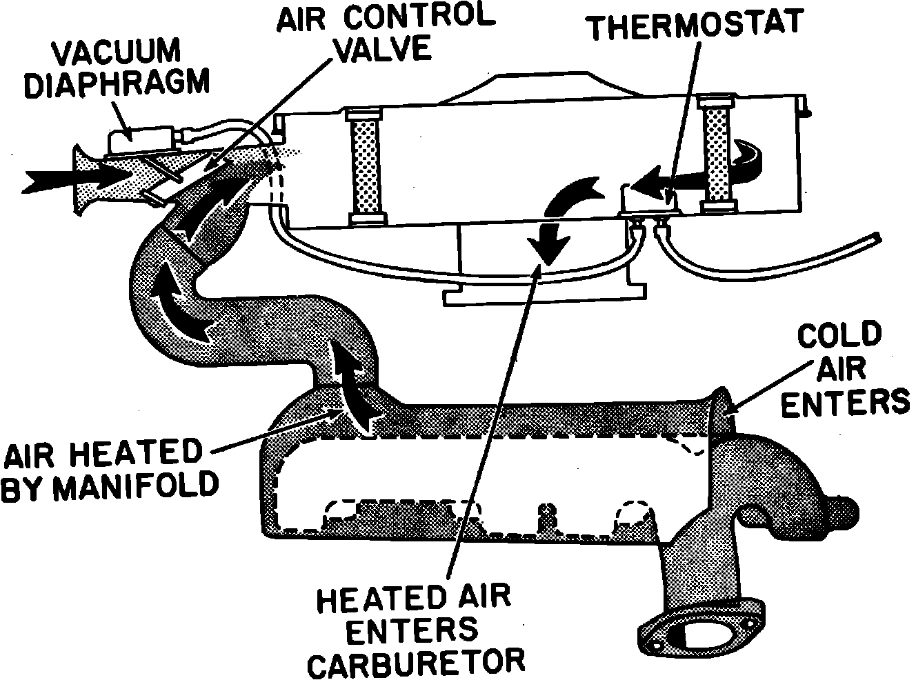 During engine warm-up, air is heated by a shroud surrounding the exhaust manifold, then the air is piped to the air cleaner snorkel and into the carburetor/EFI. The vacuum diaphragm controls the air control valve which is closed to outside air. Therefore all air entering the carburetor/EFI is heated.