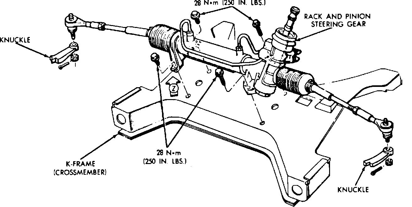 In the event a steering gear-to-crossmember (K-frame) attaching bolt/nut is cross-threaded or broken during steering gear installation or removal, it is no longer necessary to replace the crossmember (K-frame). Only the damaged bolt/nut need be replaced as described in the following procedure.