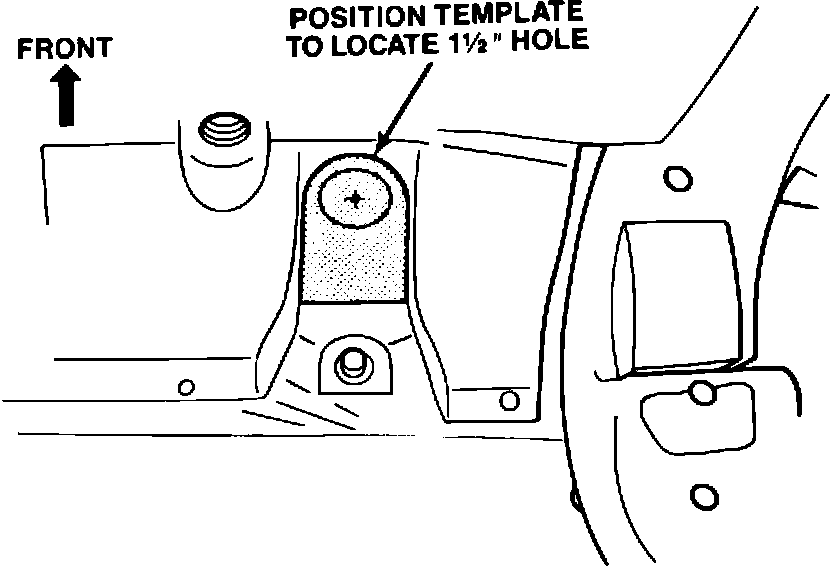 6. To provide access for installing the new retaining nut at either or both of the two front locations of the crossmember, use a 1-1/2 inch hole saw to cut a hole at the lower center of the crossmember as shown in Figure 2. Use the template provided to locate the center of the access hole.