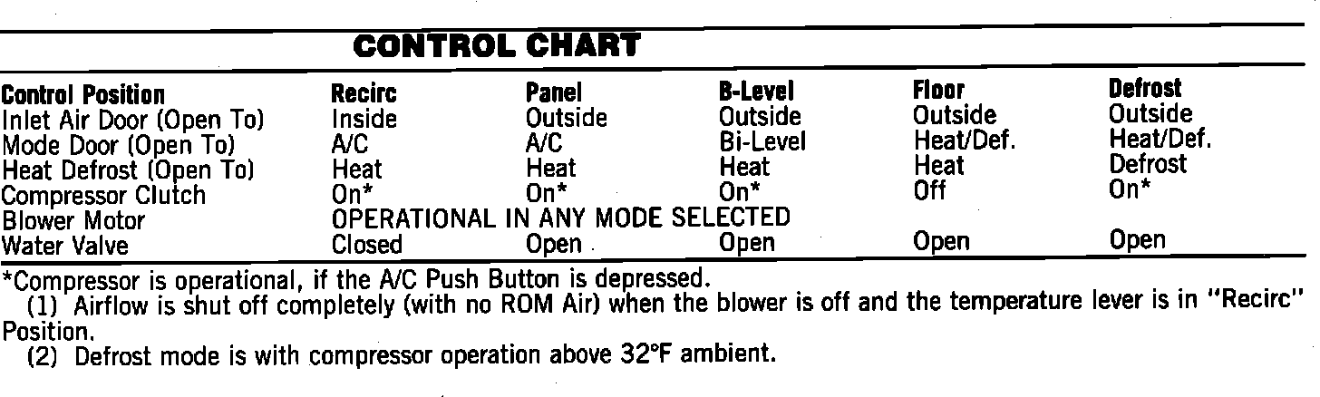 4. Refer to control chart, to check position of doors, operation of compressor clutch, blower motor, and water valve. Water valve is open when no vacuum is applied.