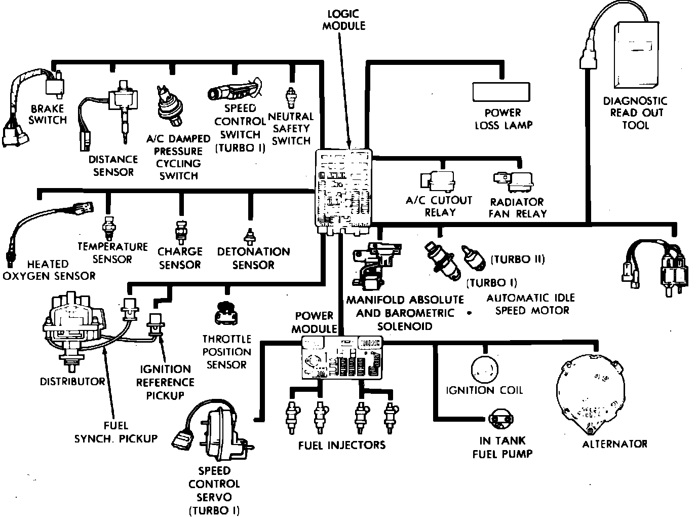 This system combines an electronic fuel and spark advance control system with a turbocharged intake system to provide a precise air/fuel ratio under all driving conditions. This system utilizes a logic module, a digital pre-programmed computer, to regulate ignition timing, air/fuel ratio, emission control devices and idle speed.