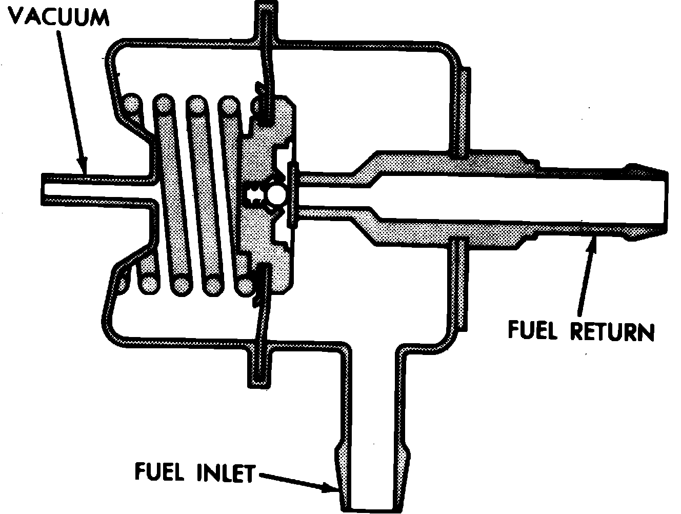 The fuel pressure regulator, Fig. 5, located downstream of the fuel injector on the throttle body, maintains a constant fuel pressure of 55 psi across the injector tip. The spring-loaded diaphragm in the regulator is assisted by vacuum in the throttle body above the throttle valve. As venturi vacuum increases, less pressure is needed to supply the same amount of fuel into the air flow. In order to fine tune the fuel pressure under all operating conditions, the vacuum assists in opening the fuel port during high vacuum conditions.