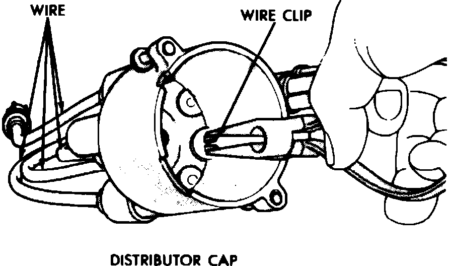 2. Using a pair of suitable long nosed pliers, remove spark plug wires from distributor cap by squeezing wire clips and pushing out, Fig. 8. Do not remove spark plug wires from distributor cap unless nipples are damaged or cable testing indicates high resistance or broken insulation.