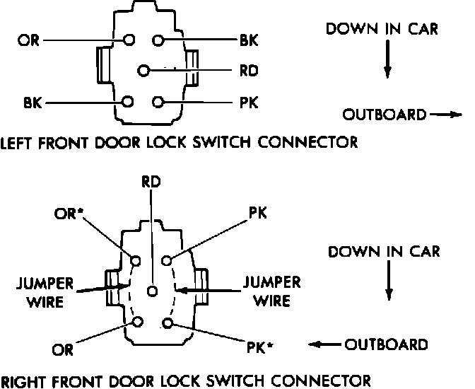 1. Remove the right door switch from the door panel and disconnect the wires from the back of the switch. Connect jumper wires as indicated to the right door wiring harness. These jumper wires take the place of the switch in the inactive position. Operate the door locks using the left door switch.