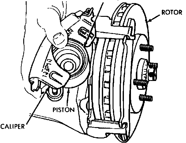 4. Remove caliper from disc by sliding caliper assembly out and away from braking disc. Suspend caliper with wire so as not to damage flexible brake hose.
