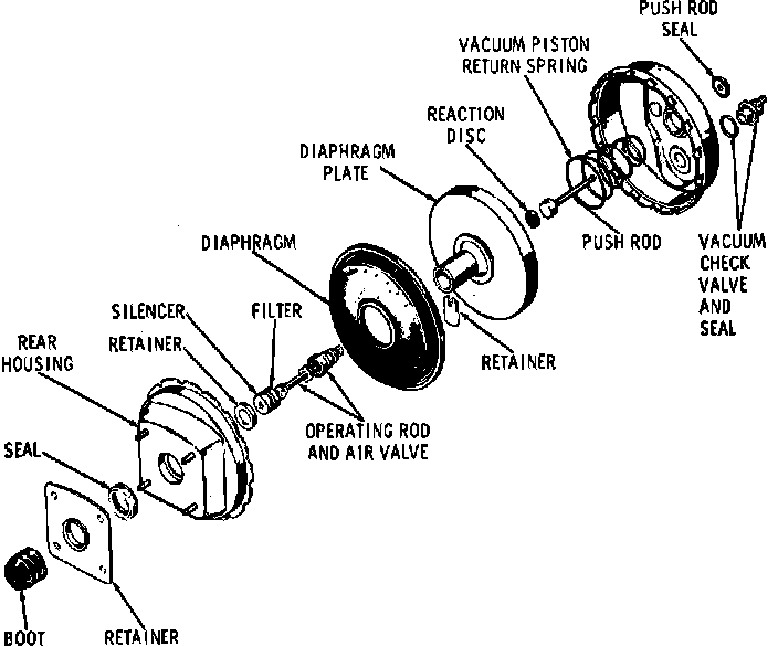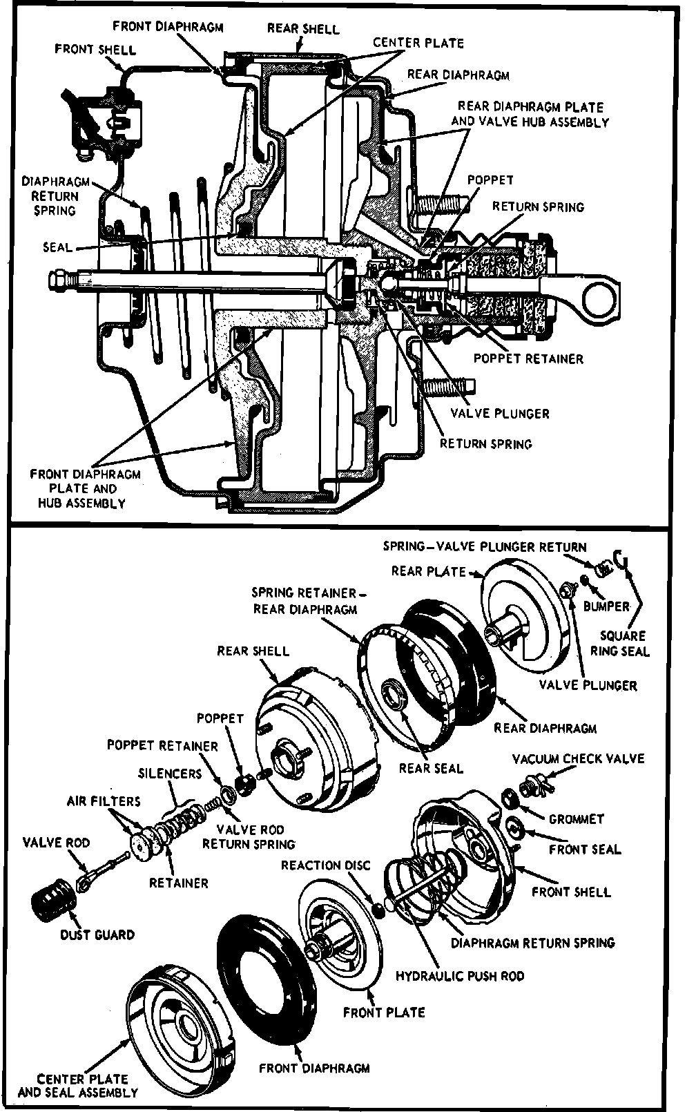 Upon application of the brakes, the valve rod and plunger move to the left in the power diaphragm to close the vacuum port and open the atmospheric port to admit air through the air cleaner and valve at the rear diaphragm chamber. With vacuum present in the rear chamber, a force is developed to move the power diaphragm, hydraulic pushrod and hydraulic piston or pistons to close the compensating port or ports and force fluid under pressure through the residual check valve or valves and lines into the front and rear wheel cylinders to actuate the brakes.
