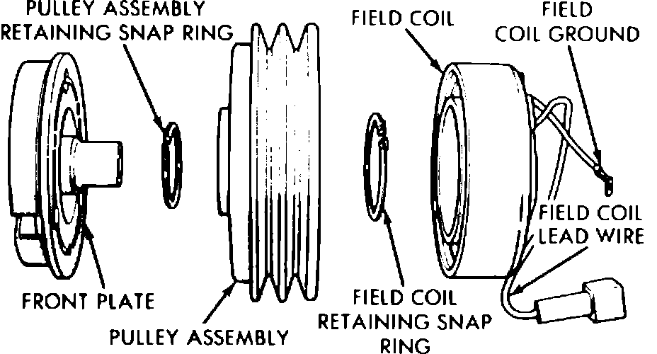 1. Remove drive belt from pulley. Disconnect field coil wiring.