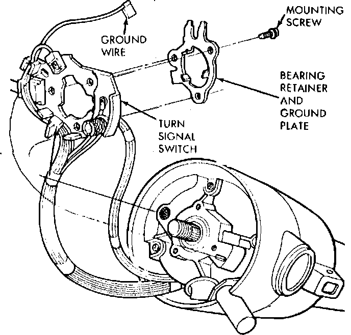 8. Remove turn signal switch and upper bearing attaching screws. Carefully remove turn signal switch, while guiding wire up through column opening.