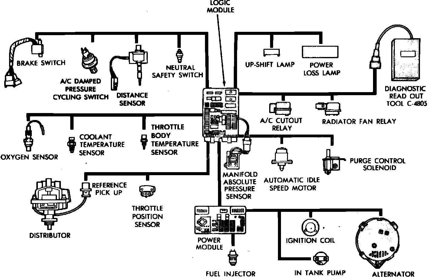 The electronic, single point fuel injection system used in 1986-87 models uses a pre-programmed ``Logic Module'' to control air/fuel mixtures delivered to the engine, ignition timing, idle speed, various emission control devices, the engine cooling fan and the charging system. The logic module monitors inputs from various engine and vehicle sensors, computes ideal operating parameters for the controlled subsystems based on these inputs, and controls operation of the subsystems. Sensors used to control system operations include: an exhaust gas oxygen sensor, Manifold Absolute Pressure (MAP) sensor, throttle position sensor, coolant and throttle body temperature sensors, distributor reference signal, vehicle distance sensor, and the neutral safety and A/C compressor clutch switches, Fig. 1.