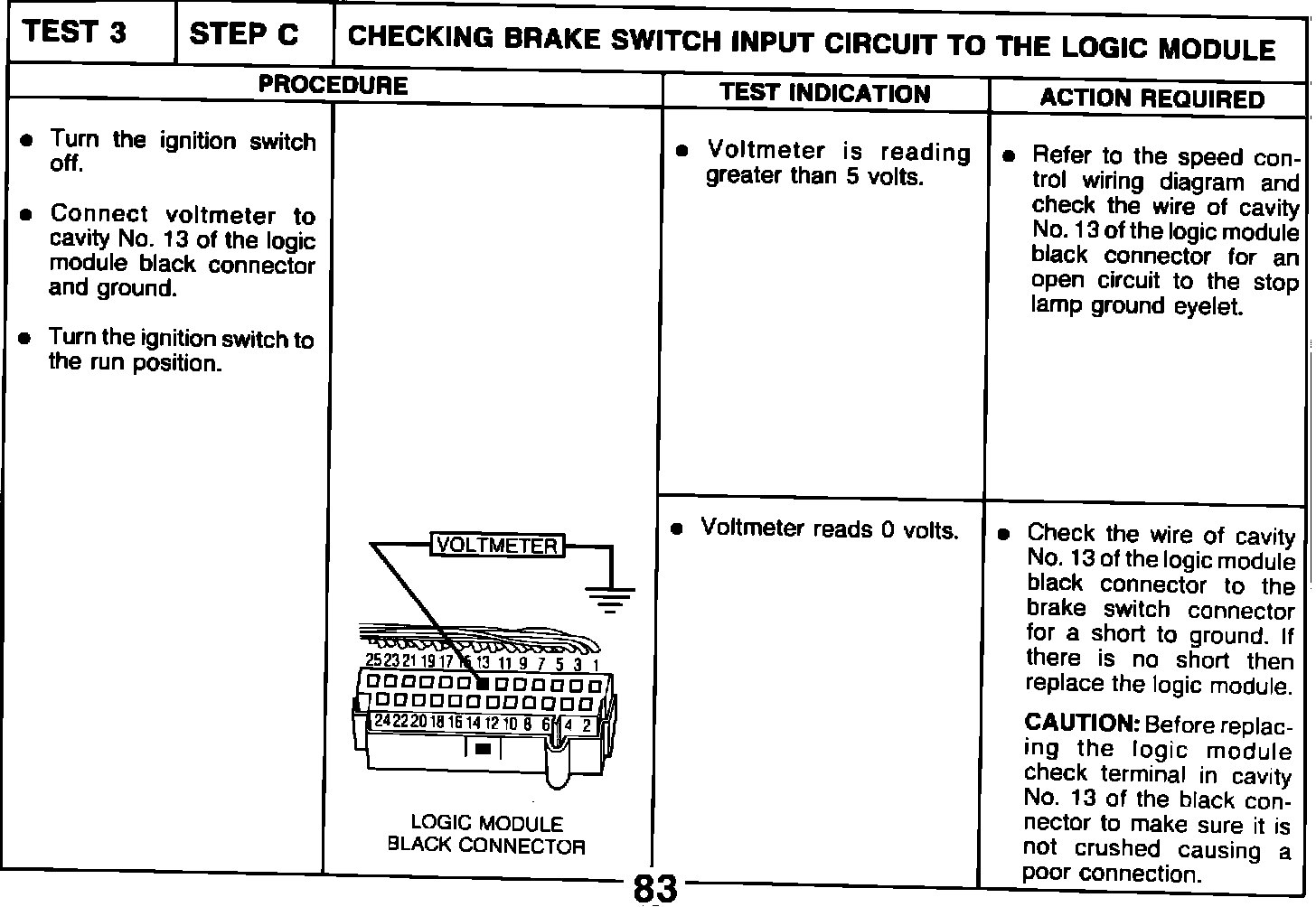 TEST 3 STEP C CHECKING BRAKE SWITCH INPUT CIRCUIT TO THE LOGIC MODULE