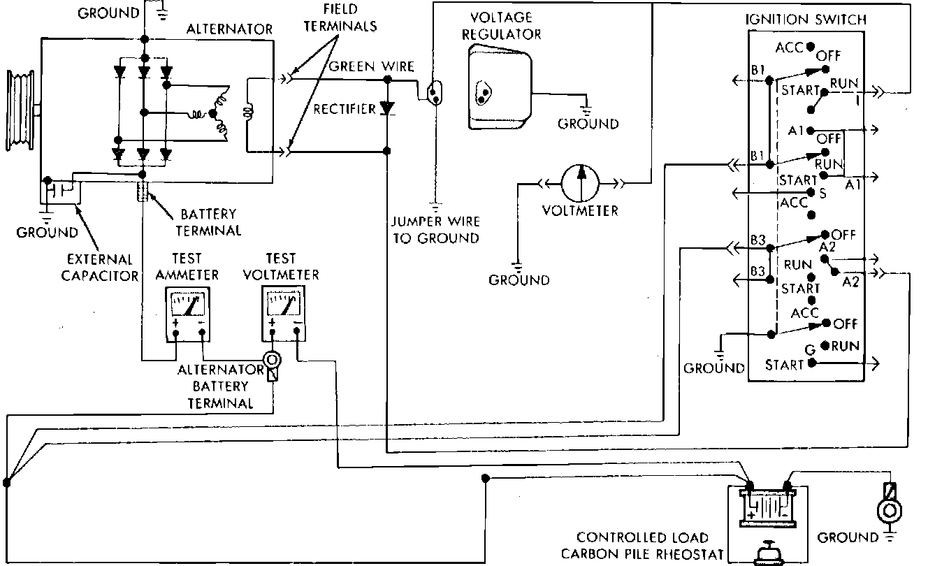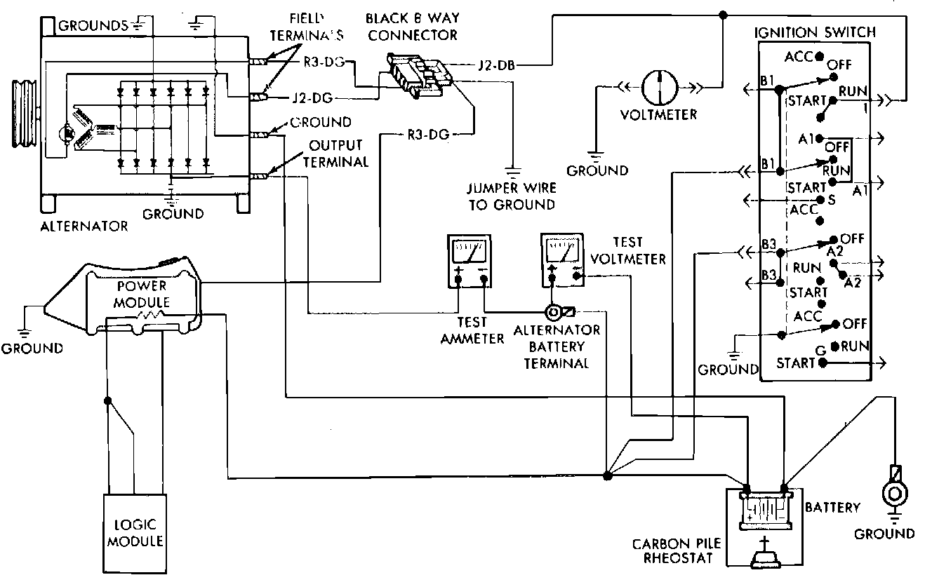 7. Adjust engine speed and carbon pile rheostat to obtain 20 amps in the circuit and check voltmeter reading. Reading should not exceed .5 volts. If a higher voltage drop is indicated, inspect, clean and tighten all connections in the circuit. A voltage drop test at each connection can be performed to isolate the problem.