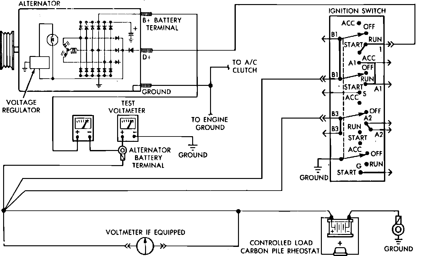 4. Adjust carbon pile rheostat and engine speed to obtain 28---35 amps at 13.5 volts and 500 RPM, 75---85 amps at 13.5 volts and 1000 RPM and 89 amps at 13.5 volts and 2000 RPM. While increasing engine speed, do not allow voltage to exceed 16 volts.